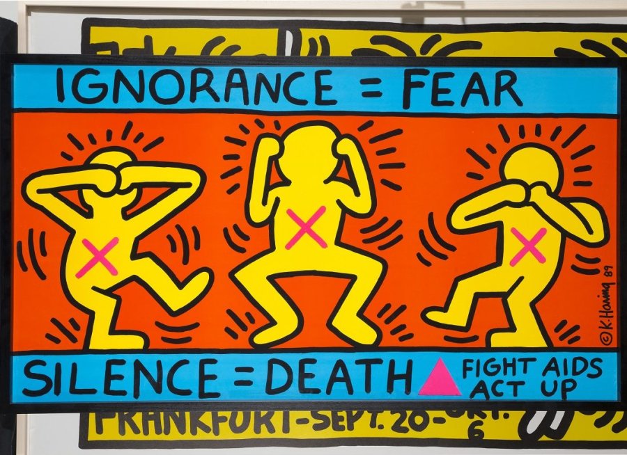 Un anno dopo aver scoperto di avere l’AIDS, Keith Haring creò l’opera Ignorance = Fear / Silence = Death, un’accusa contro la discriminazione subita in quegli anni da tutte le vittime, quando la malattia era ancora poco conosciuta.