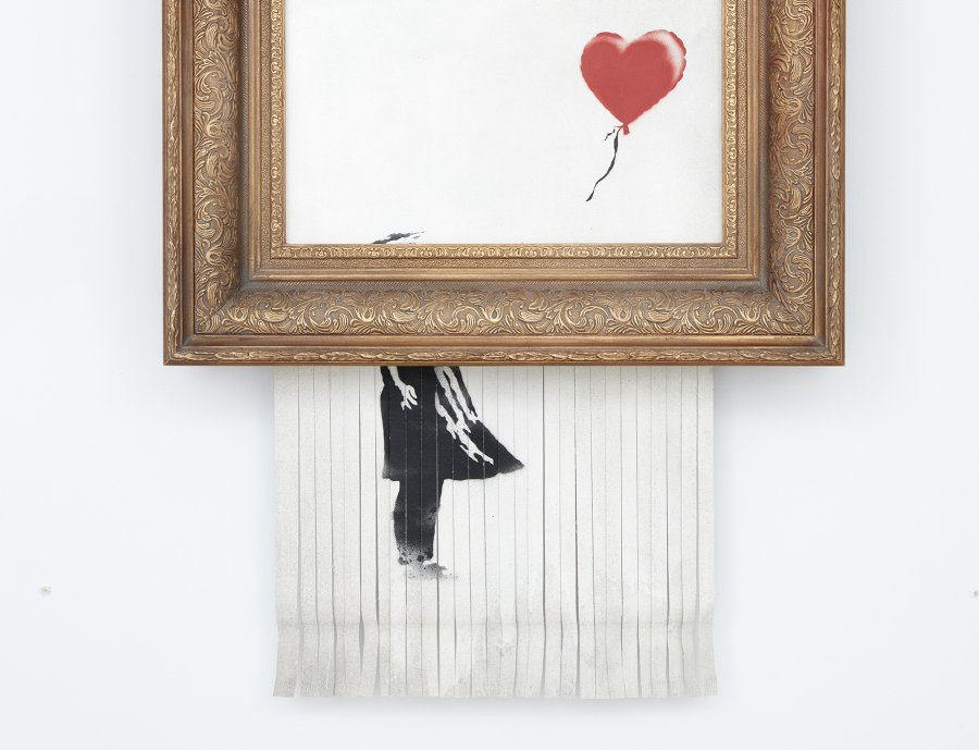 Le convinzioni sovversive di Banksy, che hanno ispirato la sua opera più iconica, Girl With Balloon, nel 2018 lo hanno spinto a creare un dipinto che messo all’asta da Sotheby’s si è autodistrutto pochi istanti dopo l’asta di chiusura. L’opera fu successivamente ribattezzata Love Is In The Bin, i cui resti furono ironicamente venduti a un prezzo ancora maggiore.