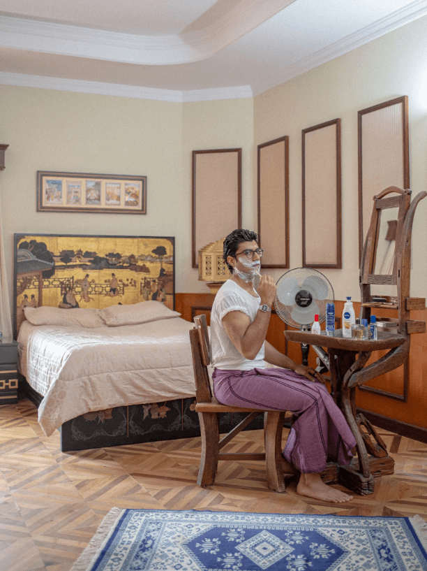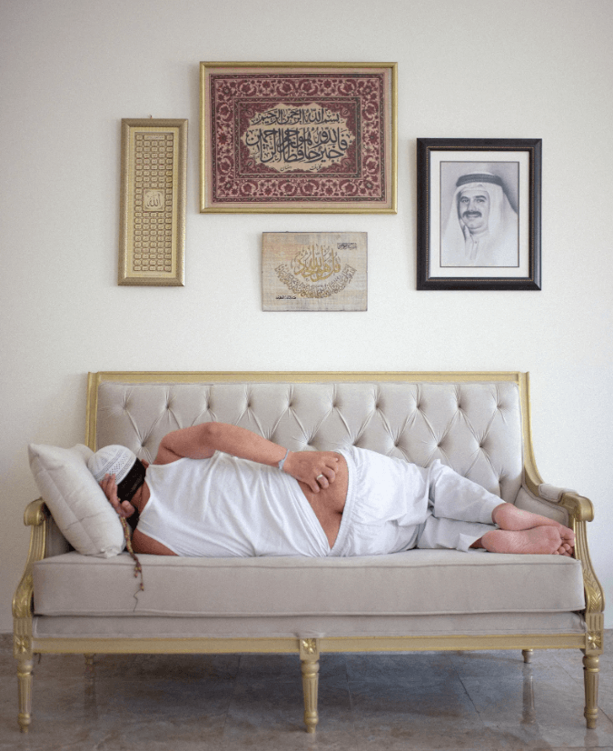 Scattate nel corso di tre anni, dal 2020 al 2023, le fotografie della serie sono nostalgiche e spesso umoristiche, evocando i comfort familiari della patria dell’artista in vari contesti (soggiorni, cucine, il mare) mentre pongono domande più ampie su come la mascolinità si esprime nel regno del Golfo.